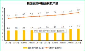 蔬菜是人類獲取營養的主要途徑之一,也是人類飲食中不可或缺的食物,其重要性僅次于糧食作物。近幾年蔬菜種植的經濟效益較高,成為農業增收、農戶受益、農村經濟發展的重要經濟產業。據統計,截止2021年蔬菜種植面積達3.3億畝,產量達7.8億噸,種植面積和產量仍有增長趨勢。
