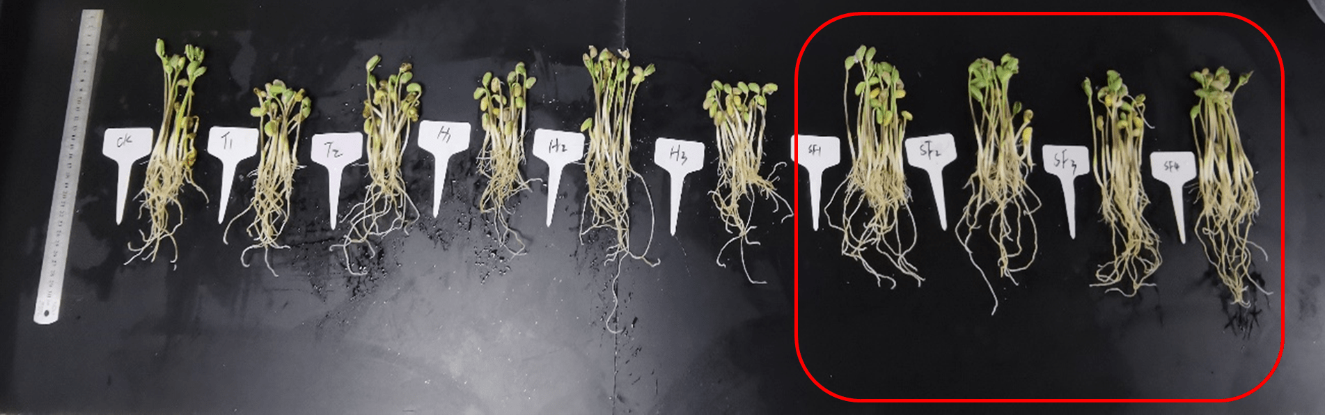 (2)測試了在低溫與高溫條件下,花粉多糖對大豆幼苗生長的影響。對比其他生物刺激素,花粉多糖在高低溫逆境條件下,可顯著促進大豆根長、莖粗及鮮重增加,其中高溫條件下大豆根長根重分別增加了20.45%、55.58%,顯著優于其它生物刺激素效果。