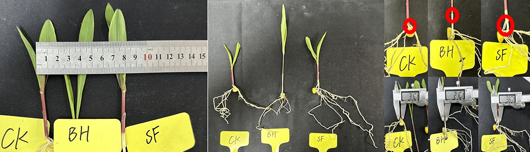 (1)針對玉米作物:在14℃~22℃培養條件下,對比其他種子處理劑,采用50g/100kg花粉多糖進行玉米拌種處理,試驗27天后發現,花粉多糖處理后玉米株高生長雖弱于其他種子處理劑,但莖粗、根鮮重、氣生根長出率及氣生根根長均顯著優于,其中明顯看出其他種子處理劑處理后,玉米未生長出氣生根。說明花粉多糖拌種玉米,可明顯增加玉米氣生根生長,提升玉米后期抗倒伏能力。
