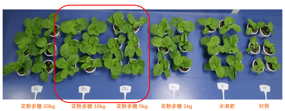 (2)根據復合肥施用量,設計減量復合肥20%,同時進行不同用量花粉多糖復配,即全量肥(60kg/畝)、減量肥(48kg/畝)、減量復配花粉多糖3、5、10kg/t。通過測試發現,相比全量復合肥處理,減量+花粉多糖10kg/t處理后,小白菜地上部分鮮重、根長、根重、冠幅、葉長、葉寬分別增加26.5%、42.2%、123.8%、7.7%、1.6%、9.3%,促進效果明顯。結合成本計算,減量后添加花粉多糖可達到降本增效的目的。